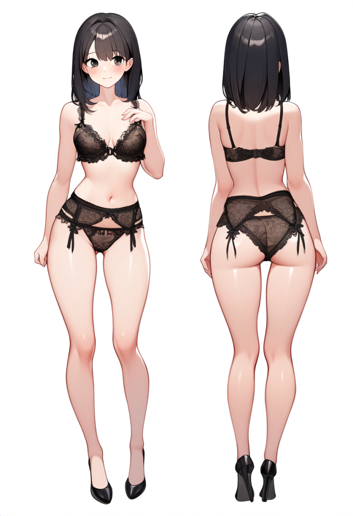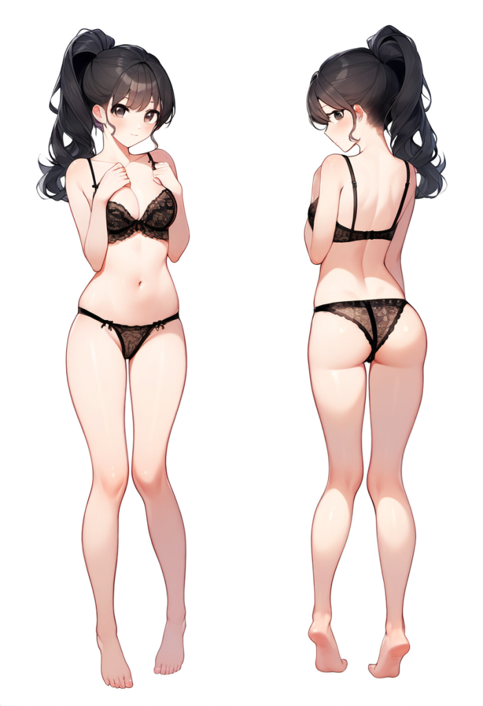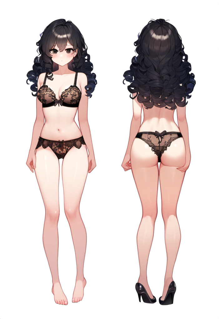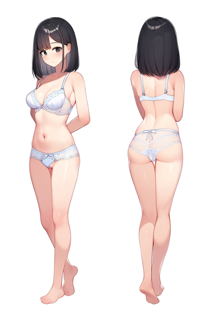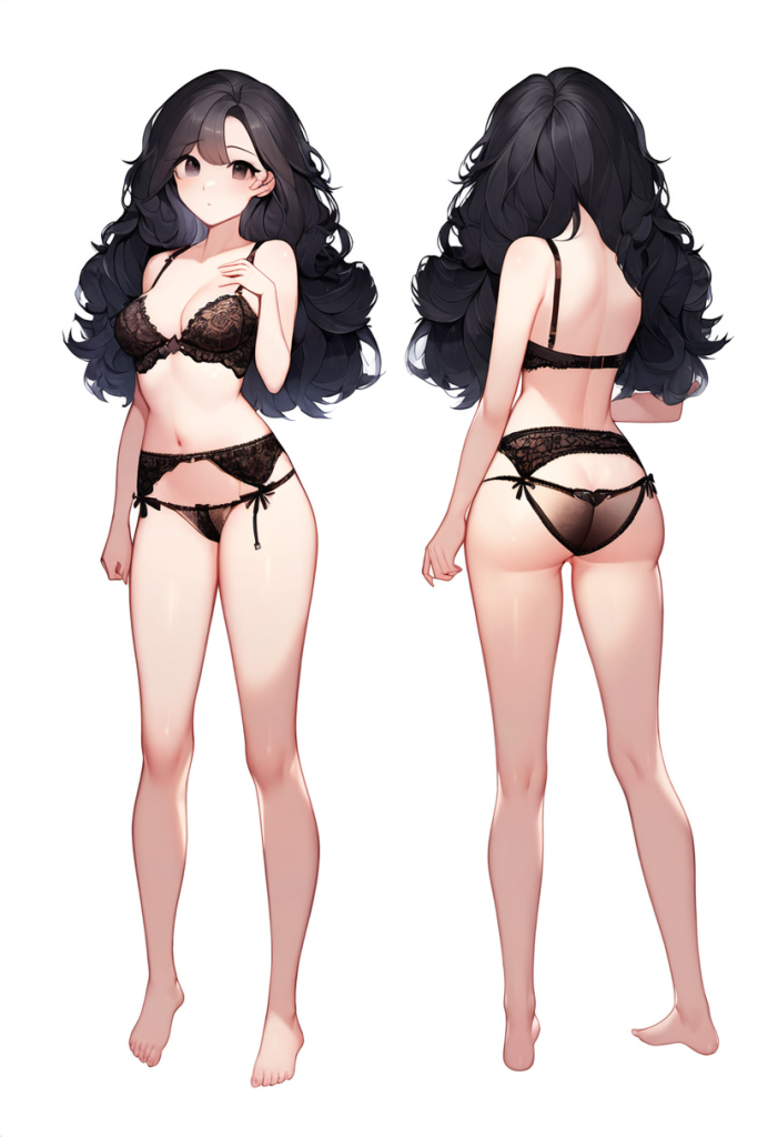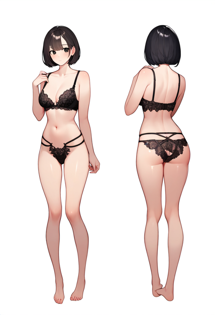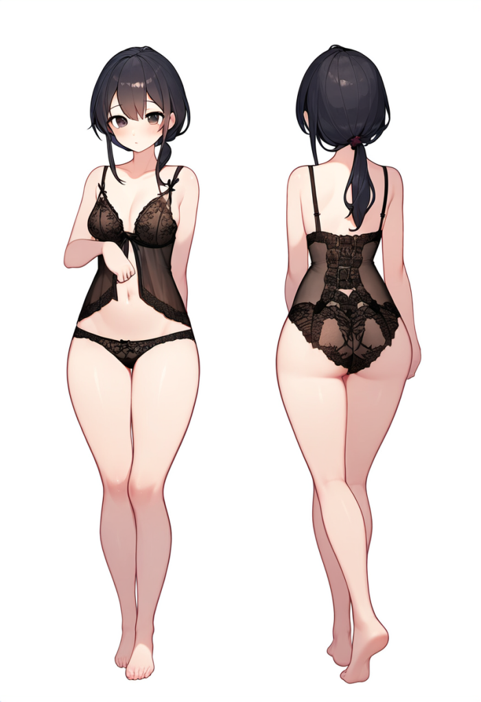 {best quality}, {very aesthetic}, {ultra-detailed}, {best illustration}, nsfw, girl, solo, full body, multiple views ,black hair, black eyes, embarrassing, lingerie, white simple background