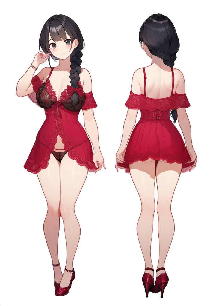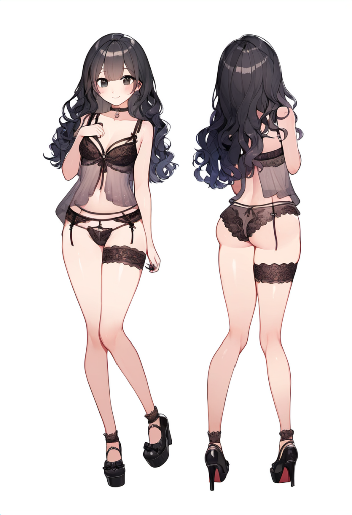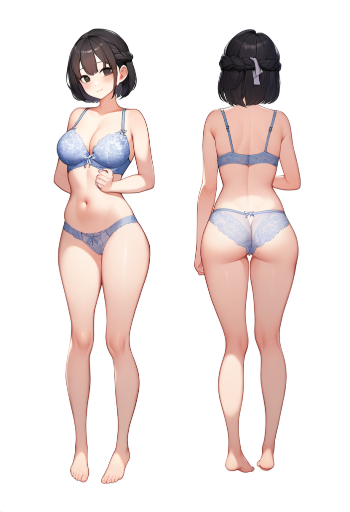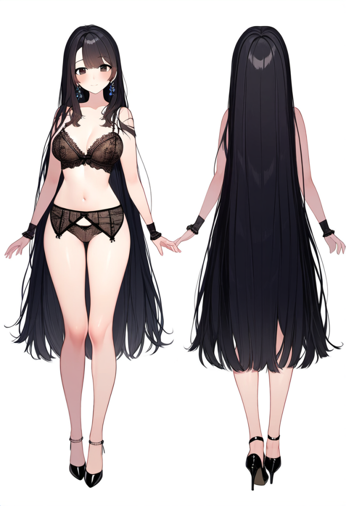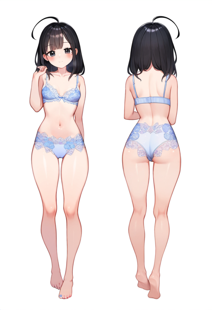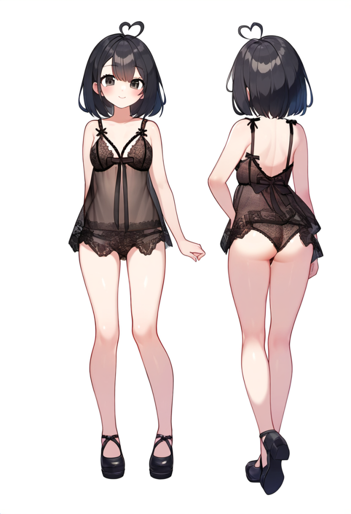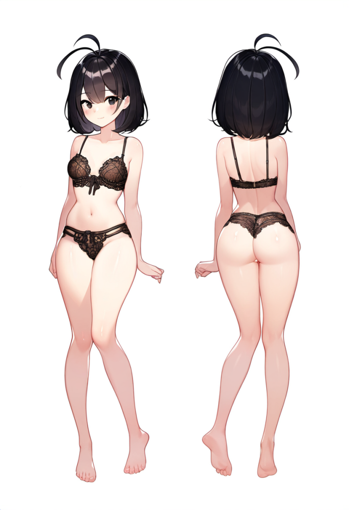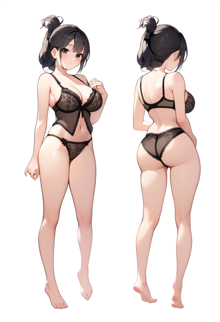 {best quality}, {very aesthetic}, {ultra-detailed}, {best illustration}, nsfw, girl, solo, full body, multiple views ,black hair, black eyes, embarrassing, lingerie, white simple background