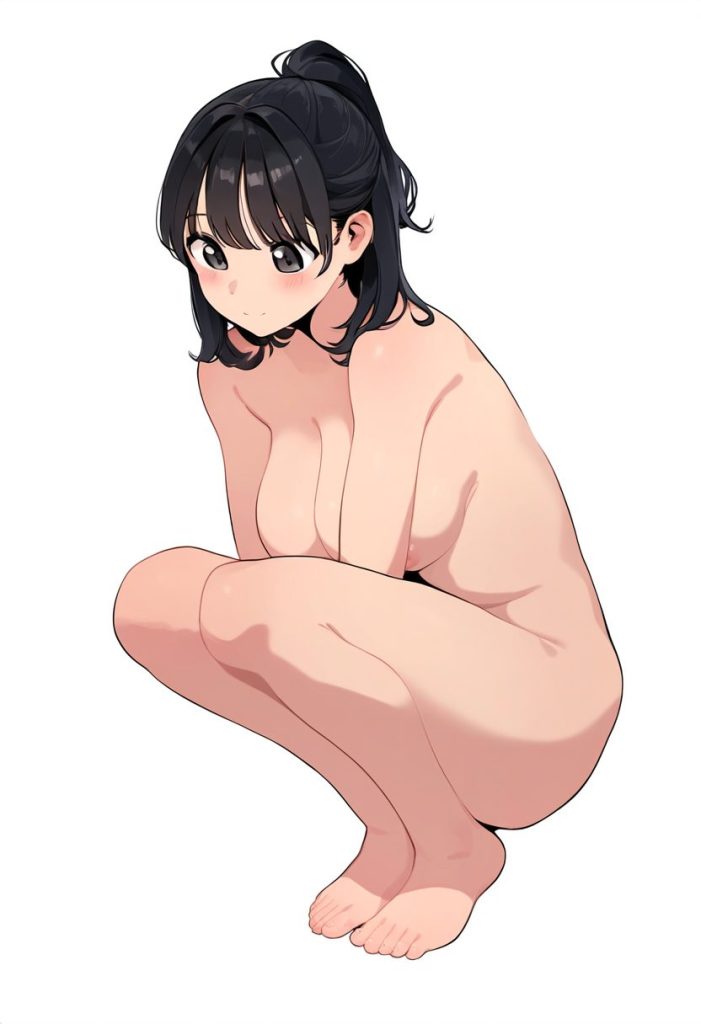looking down, {best quality}, {very aesthetic}, {ultra-detailed}, {best illustration}, nsfw, girl, solo, full body, medium hair ,black hair, high pony tail, black eyes, embarrassing, nude, white simple background