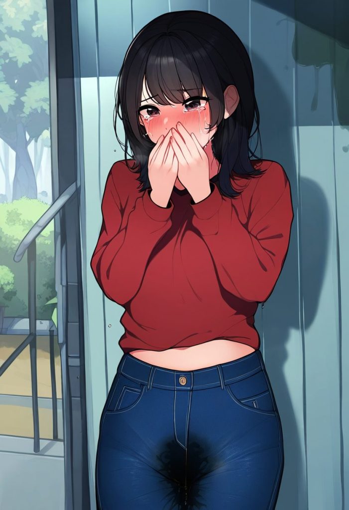 {best quality}, {very aesthetic}, {ultra-detailed}, {best illustration}, nsfw, girl, solo, medium hair ,black hair, black eyes, upset, cry, red face, covering mouth with palms, embarrassing, shirt, jeans, [[[Peeing]]], standing, wet crotch