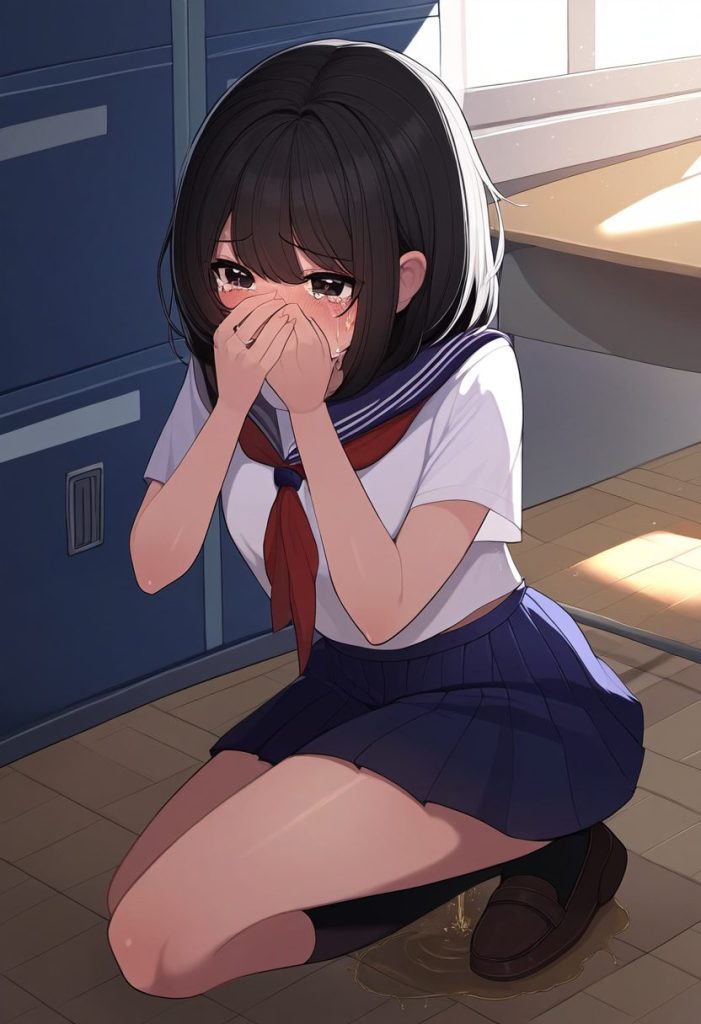 {best quality}, {very aesthetic}, {ultra-detailed}, {best illustration}, nsfw, girl, solo, full body, medium hair ,black hair, black eyes, upset, cry, red face, covering mouth with palms, embarrassing, high school uniform, [[peeing]], class room