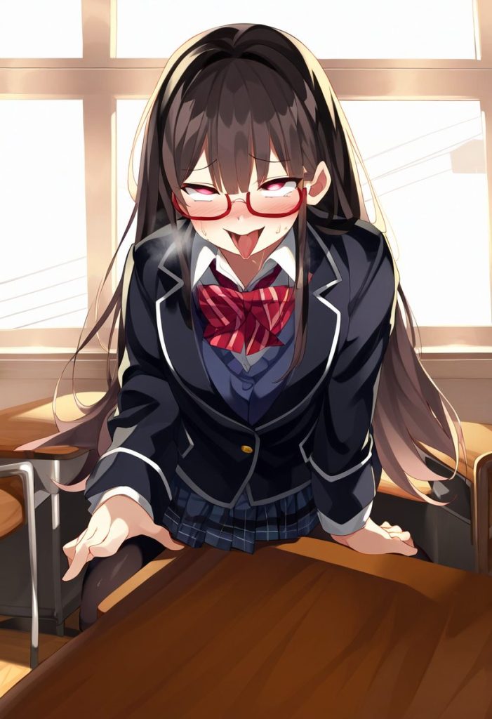 girl, ahegao, {{orgasm}}, school uniform, standing, {corner of the desk hits crotch}, best quality, very aesthetic, class room, girl behind desk, from face