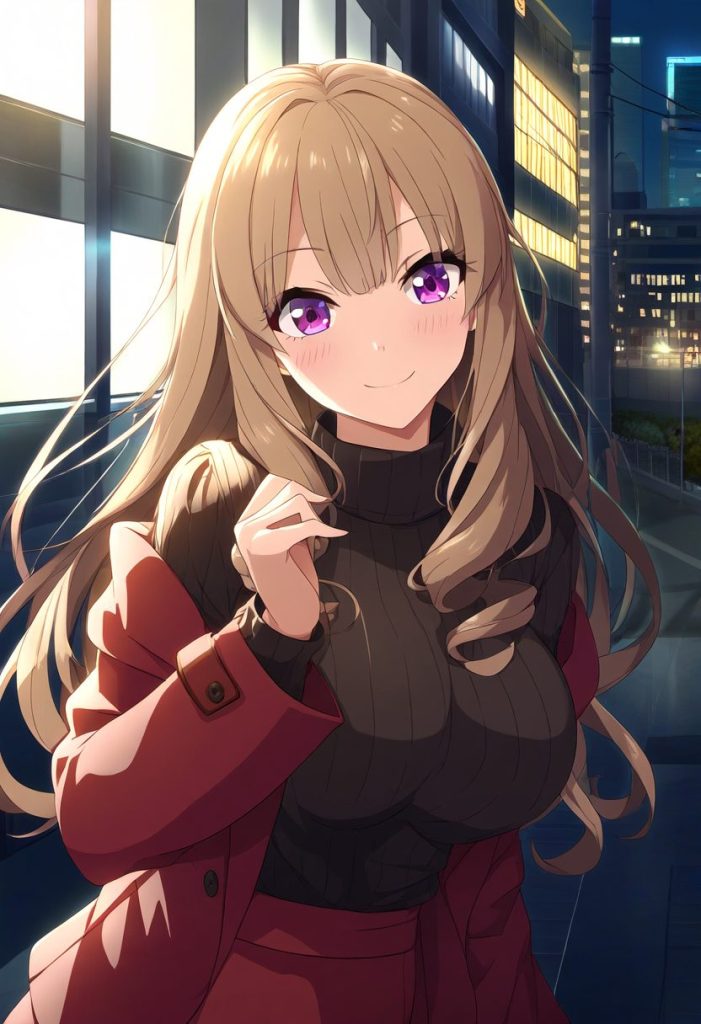 girl, eye make, light brown long hair, large breasts, sweater, dating, bloom, in city