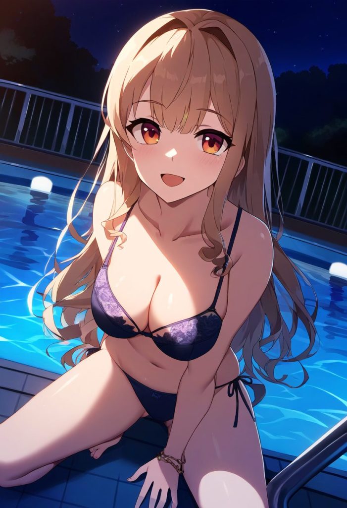 girl, light brown long hair, medium breasts, bikini, cleavage, night pool, nsfw, bloom, from above