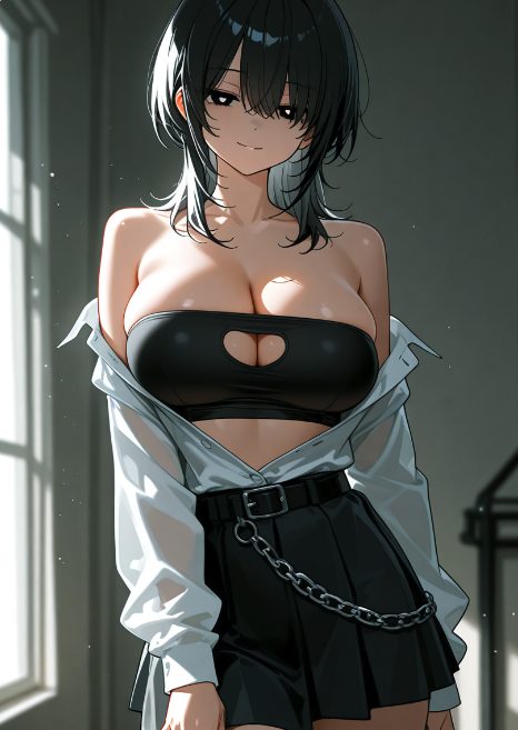 全部って……ふは、まじ?(ウチは首を傾げながら、ゆっくりとトップスを脱ぎ去り、床に落とす。肩まで露出した背中には、レースのブラジャーのストラップが食い込んでいる。)そんな焦んなくても、逃げないし。…次、なに脱げばいい?