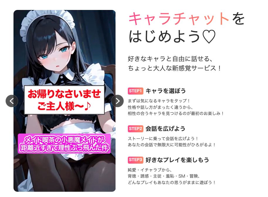 後述するけどFANZAキャラチャットはいくつかのアダルトAIチャットを一箇所に集めたサービスです。